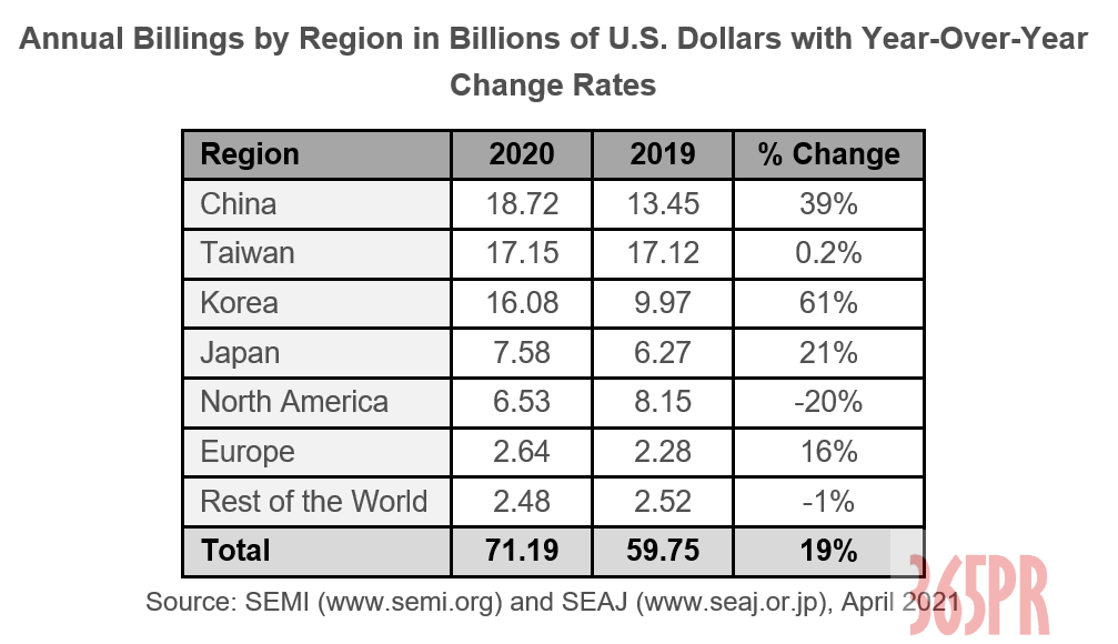 【產通社,4月16日訊】SEMI在其全球半導體設備市場統(tǒng)計報告(WWSEMS)指出,2020年全球半導體制造設備銷售額從2019年的598億美元猛增19%,達到712億美元的歷史新高。  中國大陸首次成為全球最大的半導體設備市場,銷售額增長39%,達到187.2億美元。中國臺灣地區(qū)是第二大設備市場,其銷售額在2019年呈現(xiàn)強勁增長后,在2020年保持穩(wěn)定,達到171.5億美元。韓國保持61%的增長,達到160.8億美元,居第三位。日本和歐洲分別增長了21%和16%,這兩個地區(qū)都從2019年的經濟衰退中恢復過來。在連續(xù)三年增長之后,2020年北美降低了20%。 2020年全球晶圓加工設備的銷售額增長了19%,而其他前端細分市場的銷售額增長了4%。封裝在所有地區(qū)均顯示強勁增長,2020年市場增長34%,測試設備總銷售額增長20%。   根據SEMI和日本半導體設備協(xié)會(SEAJ)會員提交的數(shù)據,這份全球半導體設備市場統(tǒng)計報告總結了全球半導體設備行業(yè)每月出貨金額。設備類別包括晶圓加工、封裝、測試以及其他前端設備,包括掩模/標線片制造,晶圓制造和fab廠設施。(張怡,產通發(fā)布)