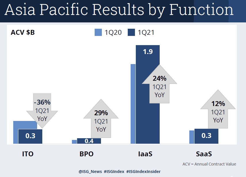 【產(chǎn)通社,5月10日訊】技術(shù)研究和咨詢公司Information Services Group(ISG;Nasdaq股票代碼:III)報(bào)告顯示,一季度在亞太區(qū)技術(shù)和商業(yè)服務(wù)市場中,基于云的服務(wù)的支出占比達(dá)到了創(chuàng)紀(jì)錄的85%,盡管對傳統(tǒng)托管服務(wù)的需求有所下滑,但基礎(chǔ)設(shè)施即服務(wù)(IaaS)和軟件即服務(wù)(SaaS)需求增長達(dá)到兩位數(shù)。  亞太區(qū)ISG指數(shù)(Asia Pacific ISG Index)衡量年合同價(jià)值(ACV)在500萬美元或以上的商業(yè)外包合同。該指數(shù)顯示,亞太區(qū)一季度綜合市場ACV為26億美元,同比增長11%,但比去年第四季度的歷史高點(diǎn)下降9%。  增長主要來自“即服務(wù)”(as-a-service)市場的爆發(fā),該領(lǐng)域同比增長22%,達(dá)到22億美元,其中IaaS增長24%,達(dá)到19億美元,而SaaS增長12%,達(dá)到2.92億美元。  同時(shí),托管服務(wù)較上年同期下降25%至3.9億美元,其中IT外包(ITO)下滑36%至2.82億美元,ITO的走弱抵消了業(yè)務(wù)流程外包(BPO)激增29%至1.08億美元的亮眼表現(xiàn)。  托管服務(wù)在中國、日本和韓國市場總體有所增長,但在該地區(qū)第一大市場澳大利亞/新西蘭(ANZ)則下降19%。合同活動(dòng)處于五年來最低水平,幾乎未出現(xiàn)大型交易。在過去18個(gè)月中,亞太區(qū)僅有七筆超過4,000萬美元的交易。  ISG亞太區(qū)合伙人兼區(qū)域負(fù)責(zé)人Scott Bertsch表示:“亞太市場繼續(xù)受基于云的服務(wù)需求的驅(qū)動(dòng)。在托管服務(wù)方面,傳統(tǒng)ITO服務(wù)市場尤其是基礎(chǔ)設(shè)施市場陷入困境,而規(guī)模較小的BPO細(xì)分市場通常會(huì)出現(xiàn)大起大落的季度表現(xiàn)。同時(shí)我們也看到,超大規(guī)模公司之間的市場份額爭奪戰(zhàn)不斷升級,特別是在金融服務(wù)領(lǐng)域!  在第一季度金融服務(wù)行業(yè)的超大規(guī)模協(xié)議中,總部位于澳新地區(qū)(ANZ)的金融服務(wù)公司AMP宣布,將在2022年之前將其所有本地工作負(fù)載遷移到Amazon Web Services云上,而韓國的Kyobo Life Insurance宣布將遷移其大數(shù)據(jù)系統(tǒng)到AWS。同時(shí),微軟(Microsoft)與新西蘭銀行(Bank of New Zealand)簽署協(xié)議,將把名為M1K的項(xiàng)目中的1,000個(gè)應(yīng)用程序遷移到Azure。  SaaS領(lǐng)域的重大交易包括:Kawasaki Engines就其制造云與Salesforce簽署協(xié)議;總部位于德國的運(yùn)動(dòng)休閑鞋和服裝制造商PUMA旗下子公司PUMA India利用Salesforce的商業(yè)云來提升在線用戶體驗(yàn)。全球首屈一指的新西蘭獼猴桃銷售商Zespri International簽約成為該地區(qū)首批使用SAP S/4HANA私有云版本的SAP客戶之一。同時(shí),必和必拓(BHP)正在使用微軟的Dynamics來確保澳大利亞農(nóng)村地區(qū)采礦工人的安全。  在ITO領(lǐng)域,兩個(gè)應(yīng)用開發(fā)與維護(hù)(ADM)獎(jiǎng)項(xiàng)引人注目:埃森哲(Accenture)將為總部位于日本的化妝品和個(gè)人護(hù)理跨國公司資生堂(Shiseido)實(shí)施基于云的系統(tǒng),而三菱汽車(Mitsubishi Motors)則將其與IBM日本的IT基礎(chǔ)設(shè)施合同繼續(xù)延長五年。  ISG預(yù)測,2021年全球基于云的服務(wù)市場(IaaS和SaaS)將增長18%,相比年初20%的預(yù)測值略有下調(diào)。同時(shí),ISG已將其對托管服務(wù)的增長預(yù)測從年初的3%上調(diào)為5%。  查詢進(jìn)一步信息,請?jiān)L問官方網(wǎng)站 http://isg-one.com/research/articles/isg-index。(Lisa WU,365PR Newswire)