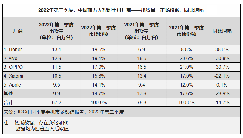 【產(chǎn)通社,7月30日訊】國際數(shù)據(jù)公司(IDC)手機(jī)季度跟蹤報(bào)告顯示,2022年第二季度,中國智能手機(jī)市場出貨量約6,720萬臺(tái),同比下降14.7%。上半年國內(nèi)智能機(jī)市場出貨量約1.4億臺(tái),同比下降14.4%。