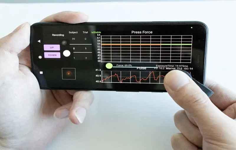 該夾子是一個(gè)3D打印的塑料附件,可以安裝在智能手機(jī)的攝像頭和閃光燈上。它的光學(xué)設(shè)計(jì)類似于針孔相機(jī)。當(dāng)用戶按下夾子時(shí),智能手機(jī)的閃光燈就會照亮指尖。然后,光線通過針孔大小的通道投射到相機(jī)上,形成一個(gè)紅色圓圈的圖像。夾子內(nèi)的彈簧允許用戶以不同的力按壓。用戶按下的力度越大,相機(jī)上出現(xiàn)的紅色圓圈就越大。通過觀察圓圈的大小,這款應(yīng)用程序可以測量用戶指尖施加的壓力,通過觀察圓圈的亮度,它可以測量指尖進(jìn)出的血量,然后通過算法將這些信息轉(zhuǎn)換為收縮壓和舒張壓讀數(shù)。