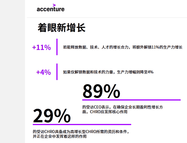 埃森哲《全球首席人力資源官研究》指出,能夠把握數(shù)據(jù)、技術(shù)和人才合力的企業(yè)有望實(shí)現(xiàn)高達(dá)11%的額外生產(chǎn)力增長(zhǎng),成功提升企業(yè)盈利能力與收入增長(zhǎng)。但是,如果企業(yè)采用的數(shù)據(jù)和技術(shù)解決方案無(wú)法做到以人為本,生產(chǎn)力增長(zhǎng)幅度將會(huì)下滑至4%。
