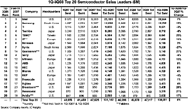 全球半導(dǎo)體市場(chǎng)下半年受金融風(fēng)暴沖擊,尤其DRAM及NAND供貨商受到產(chǎn)品價(jià)格崩跌影響,營(yíng)收表現(xiàn)不如預(yù)期,但I(xiàn)C Insights統(tǒng)計(jì),第三季全球前20大半導(dǎo)體廠營(yíng)收合計(jì)約470.17億美元,較第二季的458.78億美元小增2.5%。
