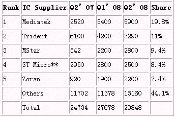 從IC供貨商來看,聯(lián)發(fā)科自今年第一季開始就超越Trident成為市場出貨冠軍,第二季仍保持同樣的好成績;主要為聯(lián)發(fā)科與臺灣代工廠商有很好的合作關(guān)系,以及與Samsung及Sony在北美市場推出戰(zhàn)斗機種的導(dǎo)入有關(guān)。Trident出貨比重持續(xù)下滑,從上一季15%下降到第二季的11%,由于他們含MPEG譯碼的全整合型單芯片導(dǎo)入進度,以及既有三星和索尼的導(dǎo)入出貨減少所致。而Zoran與晨星半導(dǎo)體(MStar)由于在臺灣代工廠商導(dǎo)入較為成功,出貨量也在逐步提高之中。
