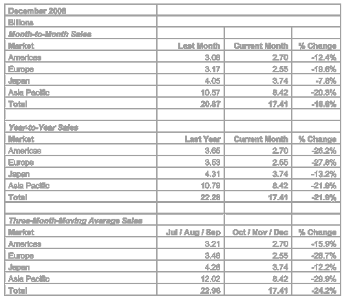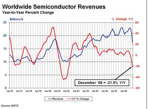 【產(chǎn)通社,2月3日】美國(guó)半導(dǎo)體協(xié)會(huì)(Semiconductor Industry Association,SIA)消息,由于全球經(jīng)濟(jì)危機(jī)的影響,2008年全球半導(dǎo)體銷(xiāo)售下滑為2486億美元,同比萎縮2.8%,為2001年以來(lái)首次年度降幅。特別是,12月銷(xiāo)售更從2007年的223億美元下降為174億美元,下降幅度高達(dá)22%,這與本年度11月的209億美元相比則下降了16.6%。