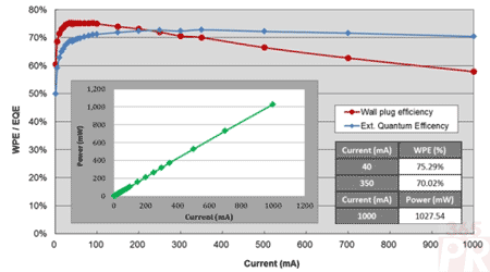 SFPN42芯片尺寸1×1mm²,實驗室環(huán)境中在操作電流40mA下,達最高光電轉換效率75%;操作電流350mA下WPE大于70%;1A操作電流下,發(fā)光強度更是超越了1W,達輸出功率1027mW,領先各業(yè)界群雄,如此亮眼的水平使LED更趨于省電節(jié)能。