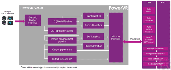 Imagination可提供用來調(diào)校圖像處理、鏡頭與傳感器的完備軟件,以協(xié)助客戶支持Aptina、Omnivision和Sony等廠商提供的各種業(yè)內(nèi)領(lǐng)先傳感器與鏡頭元件。此外,Imagination還能支持Linux、Android和其它操作系統(tǒng),包括即時(shí)操作系統(tǒng)的軟件驅(qū)動(dòng)程序。完備的軟件堆棧包括自動(dòng)白平衡、自動(dòng)對(duì)焦與自動(dòng)曝光(3A)算法。此外,還包括多種針對(duì)PowerVR Series6 GPU進(jìn)行最佳化設(shè)計(jì)的算法,包括防震、臉部偵測(cè)和HDR(高動(dòng)態(tài)范圍)。
