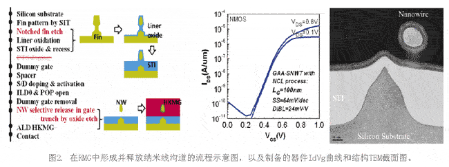 替代柵(RMG)中納米線溝道后釋放技術(shù)突破了長(zhǎng)期以來(lái)困擾產(chǎn)學(xué)研界實(shí)現(xiàn)納米線器件大規(guī)模產(chǎn)業(yè)集成的工藝限制,最大化兼容現(xiàn)有FinFET基線工藝,實(shí)現(xiàn)了高k金屬柵的均勻集成并可應(yīng)用于高密度的電路集成,具有重要的實(shí)用價(jià)值。該技術(shù)在微電子所先導(dǎo)工藝研發(fā)平臺(tái)上成功進(jìn)行了實(shí)驗(yàn)制備,所集成的器件具有接近理想的橢圓形貌溝道及優(yōu)異的亞閾值特性。該成果在2015年的IEICE Electronics Express上進(jìn)行了報(bào)道: