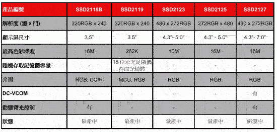 SSD2119的主要特點包括: ·橫向320RGB x 240單一芯片控制驅(qū)動器,供16M彩色非晶TFT液晶顯示屏采用 ·雙重MCU及RGB接口支持直接與一般嵌入式片上系統(tǒng) (SoC)及MCU的連接 ·SPI界面 ·內(nèi)置172,800字節(jié)GDDRAM ·內(nèi)置非揮發(fā)性內(nèi)存(OTP)以供VCOM校正 ·在3.5寸數(shù)碼相框的應(yīng)用時,可減低成本 SSD2123的主要特點包括: ·橫向480 x 272RGB單一芯片控制驅(qū)動器,供16M彩色非晶TFT液晶顯示屏采用 ·3個可編寫程序的紅綠藍伽瑪校正曲線 ·24位并行接口或8位串行接口RGB及SPI接口 ·內(nèi)置非揮發(fā)性內(nèi)存(OTP)以供VCOM校正 ·線/框互換支持高達5寸的顯示 SSD2125的主要特點包括: ·垂直272RGB x 480單一芯片控制驅(qū)動器,供16M彩色非晶TFT液晶顯示屏采用 ·3個可編寫程序的紅綠藍伽瑪校正曲線 ·24位并行接口或8位串行接口RGB及SPI接口 ·內(nèi)置非揮發(fā)性內(nèi)存(OTP)以供VCOM校正 SSD2127的主要特點包括: ·橫向480 x 272RGB單一芯片控制驅(qū)動器,供16M彩色非晶TFT液晶顯示屏采用 ·支持動態(tài)背光控制(DBC) ·點/行互換支持高達7寸的顯示屏 ·3個可編寫程序的紅綠藍伽瑪校正曲線 ·24位并行接口或8位串行接口RGB及SPI接口 ·內(nèi)置非揮發(fā)性內(nèi)存(OTP)以供VCOM校正 SSD2118B, SSD2119, SSD2123及SSD2125的樣品現(xiàn)已推出,而SSD2127的樣品將于2008年第三季開始供應(yīng)。如需更多信息,請瀏覽網(wǎng)頁http://www.solomon-systech.com。 (完)