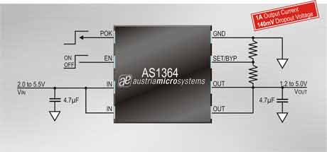 AS1364的工作電壓為2至5.5V,可理想應(yīng)用于雙節(jié)或三節(jié)標(biāo)準(zhǔn)電池及單節(jié)鋰離子電池供電的應(yīng)用。在1A典型負(fù)載條件下,AS1364工作時的最低壓差為140mV,并具有35μA的超低靜態(tài)電流,關(guān)斷電流僅有10nA,從而最大程度延長了電池使用壽命。