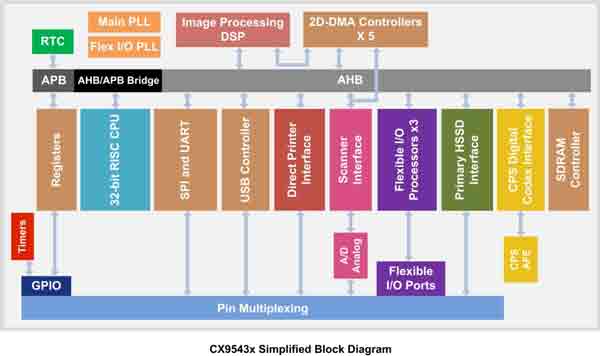 新的CX9543X傳真解決方案采用科勝訊成熟的V.17 SoftFax技術(shù)來實(shí)現(xiàn)文件傳輸。這些器件采用雙音頻模數(shù)和數(shù)模轉(zhuǎn)換器(ADC/DAC)、多音頻輸入和輸出,包括揚(yáng)聲器放大器、跨接點(diǎn)開關(guān)和用于掃描儀和其他模擬傳感器輸入的多個(gè)ADC。該SoC還包括直接打印機(jī)控制和通用串行總線接口。該影像解決方案采用一個(gè)180MHz的32位RISC處理器、一個(gè)120MHz基于數(shù)字信號(hào)處理器(DSP)的圖像處理器和3個(gè)288MHz靈活輸入/輸出處理器,后者可連接各種外設(shè),包括掃描儀、打印機(jī)、存儲(chǔ)卡和液晶顯示器(LCD)。
