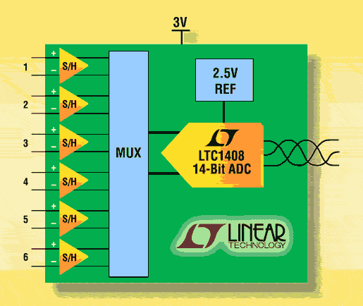LTC1408采用3條輸入選擇線配置被轉(zhuǎn)換的差分輸入數(shù)量。因此較高速度是可能的,從一個在600ksps的差分輸入到6個在100ksps的差分輸入。6個轉(zhuǎn)換結(jié)果通過一個3線接口順序提供給高速DSP串行端口。這個ADC還具有一個單獨的數(shù)字輸出電源引腳和一個雙極/單極引腳,以選擇±1.25V雙極或0V至2.5V單極輸入范圍。