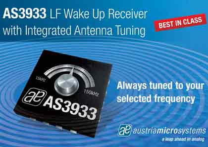 【產(chǎn)通社,10月11日訊】奧地利微電子公司(SWX股票代碼:AMS)消息,其AS3933 3通道低頻喚醒接收器,不僅實(shí)現(xiàn)電池供電系統(tǒng)的遠(yuǎn)程喚醒功能,還具有80μVrms敏感度,可對(duì)BOM成本及喚醒范圍進(jìn)行優(yōu)化,其2.7μA超低電流消耗也極大地延長(zhǎng)了電池壽命。