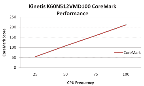 Kinetis MCU取得的測(cè)試分?jǐn)?shù)與在最大器件頻率時(shí)運(yùn)行閃存代碼的2.119 CoreMarks/MHz一樣高。認(rèn)證結(jié)果的詳情請(qǐng)參見(jiàn)http://www.coremark.org.