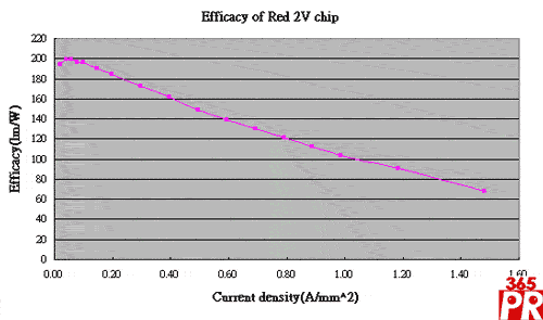 晶元光電致力于四元紅光低壓(2V)芯片與高壓(HV)芯片效率提升,相較于使用紅色熒光粉轉(zhuǎn)換形成暖白色調(diào)之技術(shù)(Phosphor Red platform),晶元光電四元芯片技術(shù)可提供更高效率及更低成本之解決方案。EPISTAR LAB最新的實驗室數(shù)據(jù)報告,小尺寸(355μm2)紅光低壓2V芯片在6mA下操作,其發(fā)光波長609nm (Wd)可達成200lm/W之高效率,在一般20mA操作電流下,效率也可達184lm/W。