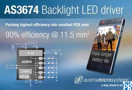 【產(chǎn)通社,2月29日訊】奧地利微電子公司(SIX股票代碼:AMS)消息,其AS3674及AS3490兩款LED背光燈驅(qū)動器芯片針對智能手機LCD顯示屏,具有業(yè)內(nèi)最高效能,峰值可達90%,包括DC-DC轉(zhuǎn)換器和電流源。新產(chǎn)品PCB封裝僅為11.5mm2 ,并只需4個外接組件,非常適合應(yīng)用于智能手機和其他將空間列為首要需求的移動設(shè)備。