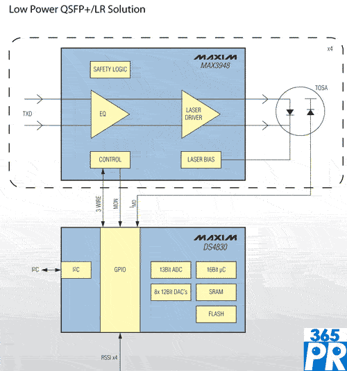 【產(chǎn)通社,8月30日訊】Maxim Integrated Products, Inc. (NASDAQ: MXIM)官方消息,其最新40G發(fā)射器芯片組可將數(shù)據(jù)中心的數(shù)據(jù)吞吐量提高4倍,且保持極低的設(shè)備功耗,所占空間僅略高于傳統(tǒng)的單通道方案。這款最新的4通道40GBASE-LR4 QSFP+芯片組包括MAX3948直流耦合激光驅(qū)動(dòng)器和DS4830光電微控制器。