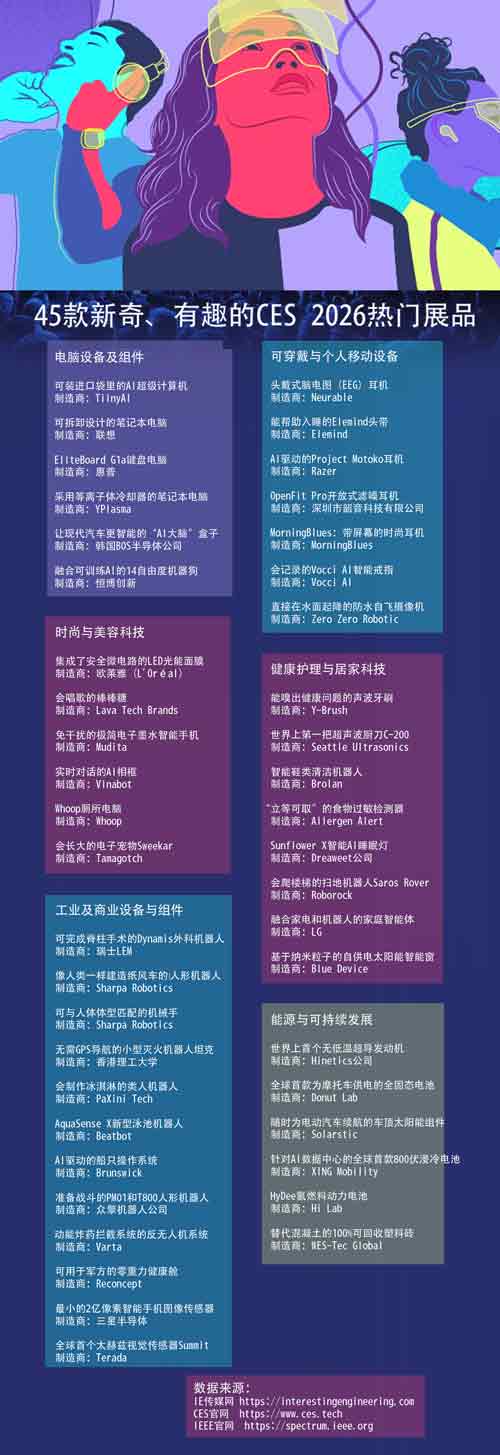 基于興趣工程(IE)媒體,IEEE和CES參展商的官網(wǎng)數(shù)據(jù),我們從CES展品海洋中選出40款新奇、有趣、有熱度的熱門產(chǎn)品,讓讀者感觸2026年消費(fèi)科技趨勢(shì)的溫度和速度。