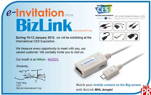【產(chǎn)通社,1月2日訊】貿(mào)聯(lián)公司(BizLink Technology)官網(wǎng)消息,其將參展2012年美國消費電子展(2012 International CES),展位號為希爾頓#42025展位。屆時將演示采用BizLink MHL dongle,通過大屏幕傳輸移動內(nèi)容等技術。