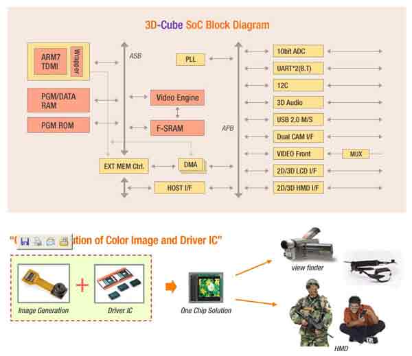 韓國e-MDT公司提供基于其3D-Cube EM3100單芯片的整套方案。EM3100 SOC芯片采用0.18um CMOS工藝生產(chǎn),采用100LQFP/100FBGA封裝,支持復(fù)合、S-VIDEO、BT.601/656、RGB、DVI等格式信號,支持QVGA到SVGA分辨率,切可以自由調(diào)整。基于3D-Cube方案的頭戴產(chǎn)品支持3G手機(jī)、i-POD、PMP、PSP、x-BOX等。