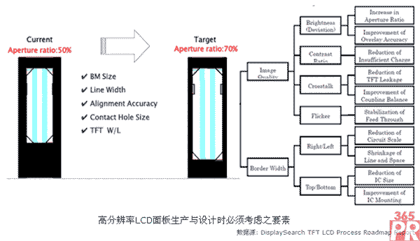 在達(dá)成高分辨率的過程,面板設(shè)計(jì)上必須注意到開口率的提升,例如由50%提高到70%;而提升的同時(shí)許多設(shè)計(jì)元素必須變更。而同時(shí)亮度(Brightness), 對(duì)比(Contrast Ratio), 訊號(hào)干擾(Crosstalk), 面板驅(qū)動(dòng)狀態(tài)不穩(wěn)(Flicker)等都會(huì)因?yàn)殚_口率的變化而影響到畫質(zhì)。而在提高開口率的同時(shí),也比須同時(shí)在面板設(shè)計(jì)上考慮薄膜晶體管的大小必須再縮小、玻璃基板上的電極布線必須更縮小以及驅(qū)動(dòng)芯片必須更縮小等等因素。