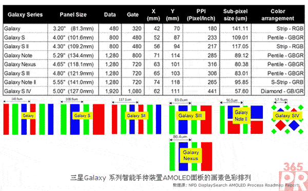 三星電子每一個(gè)世代的Galaxy智能手持裝置的AMOLED面板,由Galaxy S到Galaxy S-II, 再到Galaxy S-III, 由Galaxy Note再到Galaxy Note-II,三星不斷的在OLED像素排列上開發(fā)出獨(dú)到的創(chuàng)新,最后終于以Galaxy S-IV的Full HD分辨率,也就是440ppi(Pixel Per Inch)的超高分辨率為AMOLED立下新的里程碑。