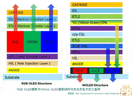 另一方面,在OLED TV面板的部分,盡管三星與LG等領(lǐng)先廠商宣稱均已批量生產(chǎn)OLED電視,但直到目前NPD DisplaySearch認(rèn)為OLED電視的兩大主流技術(shù):WOLED和RGB技術(shù)都還不能說是成熟的狀態(tài)。從2015年開始,我們預(yù)測(cè)電視將會(huì)扮演OLED面板產(chǎn)業(yè)主要的成長(zhǎng)驅(qū)動(dòng)力量,因此OLED的未來可說是寄托于OLED電視。OLED面板廠商必須趕緊解決技術(shù)問題,才能量產(chǎn)OLED TV而與LCD電視開始競(jìng)爭(zhēng)。目前的兩大主流OLED TV的技術(shù)與生產(chǎn)程序事實(shí)上相當(dāng)不同,這也是因?yàn)槠銸LED面板的結(jié)構(gòu)差異相當(dāng)大。