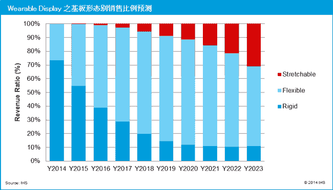 穿戴式顯示器根據(jù)基板的形態(tài)可分為Rigid、Flexible、Stretchable Display。觀察各種Display的采用率,預(yù)計2014年穿戴式顯示器的銷售額中Rigid Display將占70%以上,F(xiàn)lexible Display的銷售額則將上升到26%。預(yù)計至2023年,Rigid Display將下跌至總體的10%,F(xiàn)lexible Display與Stretchable Display各上升至約50%和30%,同時也將成為引領(lǐng)可穿戴式顯示器成長的原動力。