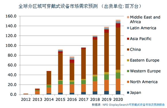NPD DisplaySearch預(yù)測(cè)穿戴設(shè)備市場(chǎng)的型態(tài)會(huì)類(lèi)似像過(guò)去的DVD、液晶電視、智能手機(jī)及其他數(shù)字消費(fèi)性產(chǎn)品將隨著三星、LG等大規(guī)模具成本優(yōu)勢(shì)的制造商進(jìn)入,進(jìn)而壓低穿戴式市場(chǎng)的價(jià)格及利潤(rùn)。同時(shí)來(lái)自中國(guó)大陸大量的設(shè)計(jì)與制造廠商以及供應(yīng)鏈的快速發(fā)展,如芯片廠商與顯示器制造商的快速投入,將是產(chǎn)業(yè)發(fā)展的一大動(dòng)力。NPD DisplaySearch可穿戴式設(shè)備市場(chǎng)及預(yù)測(cè)報(bào)告 預(yù)測(cè),2020年可穿戴式設(shè)備市場(chǎng)將從2015年的9200萬(wàn)臺(tái)達(dá)到全球1.53億臺(tái)。