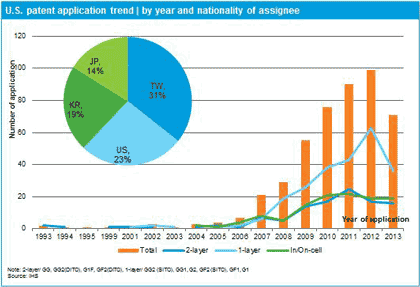 對此,IHS發(fā)行了目前觸控面板市場中的熱點(diǎn)‘電容式觸控傳感器技術(shù)’的相關(guān)核心專利分析報(bào)告。報(bào)告中將電容觸控面板傳感器技術(shù)按GFF與GG等雙層觸控傳感器G2以及G1等單層觸控傳感器,顯示觸控一體型In/On-cell觸控傳感器的結(jié)構(gòu),分別篩選出相關(guān)專利,就美國專利申請動(dòng)向進(jìn)行了定量分析。故提供上述各結(jié)構(gòu)別電容觸控傳感器相關(guān)核心專利的深層分析,以提供相關(guān)企業(yè)掌握并了解‘電容觸面板傳感器技術(shù)’領(lǐng)域的開發(fā)動(dòng)向及核心專利技術(shù)將有實(shí)質(zhì)性幫助。