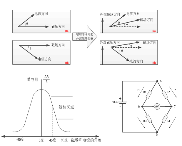 特別是,當電流方向和磁體內(nèi)磁化方向成45度角度時,外部磁場給磁阻所引起的電阻變化呈現(xiàn)出的是線性關系,所以磁傳感器在沒有外部磁力影響時候的初始角度設定為45度,利用這個線性關系再通過惠斯通電橋即可得到外界磁場值。